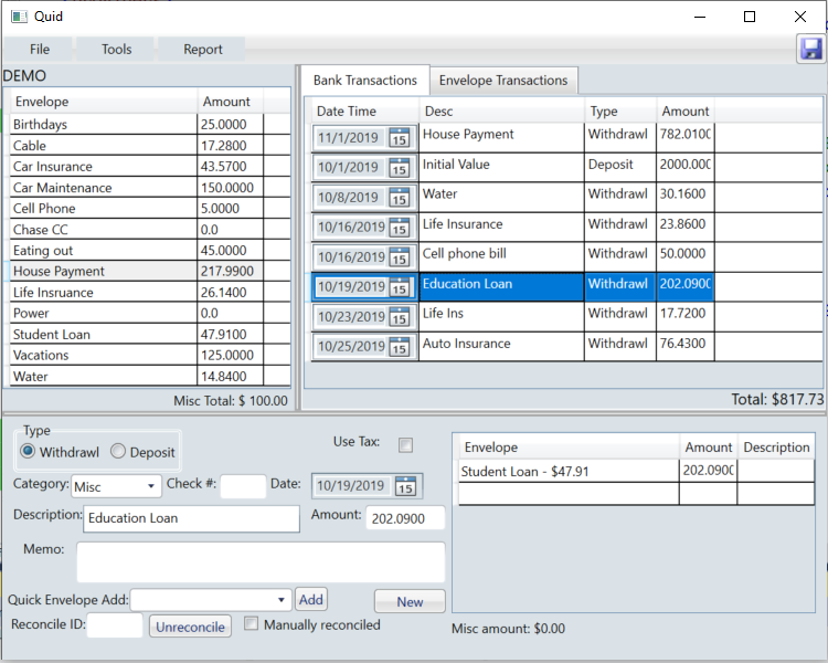 Quid is my money-management application I started several years ago (the name was picked because it's a short nickname for money). I wrote this partly as a coding exercise, but mostly because I was frustrated at none of the money management apps at the time were designed to budget via the envelope money management system.
